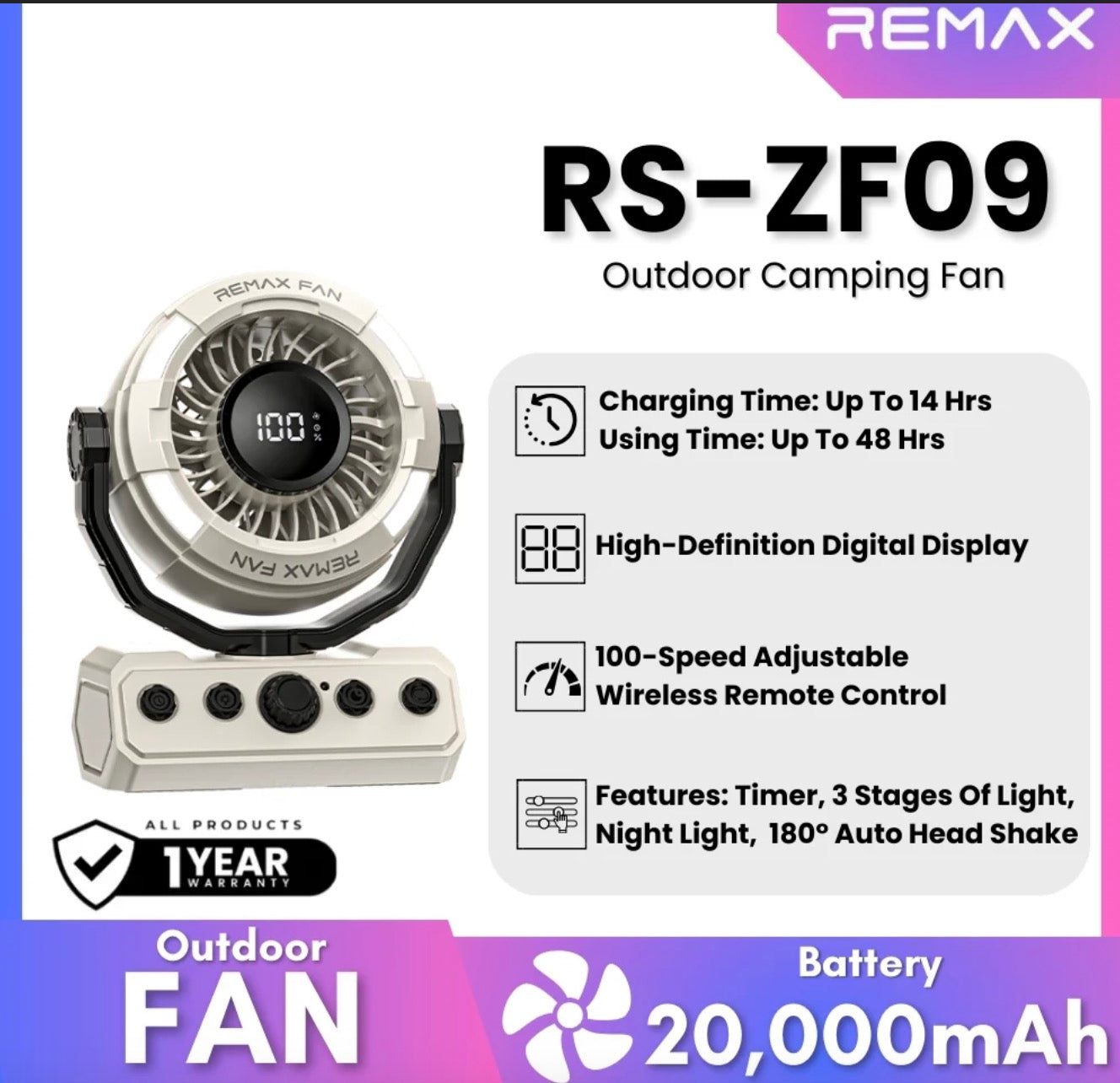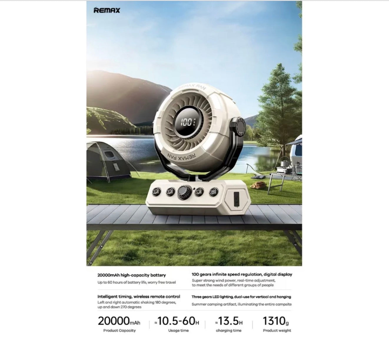 The REMAX RS-ZF09 is a powerful and versatile outdoor camping fan designed for long-lasting performance. Combining a cooling fan, high-power LED lighting, and timer function in one device, it is perfect for camping, outdoor activities, emergency use, and home backup.